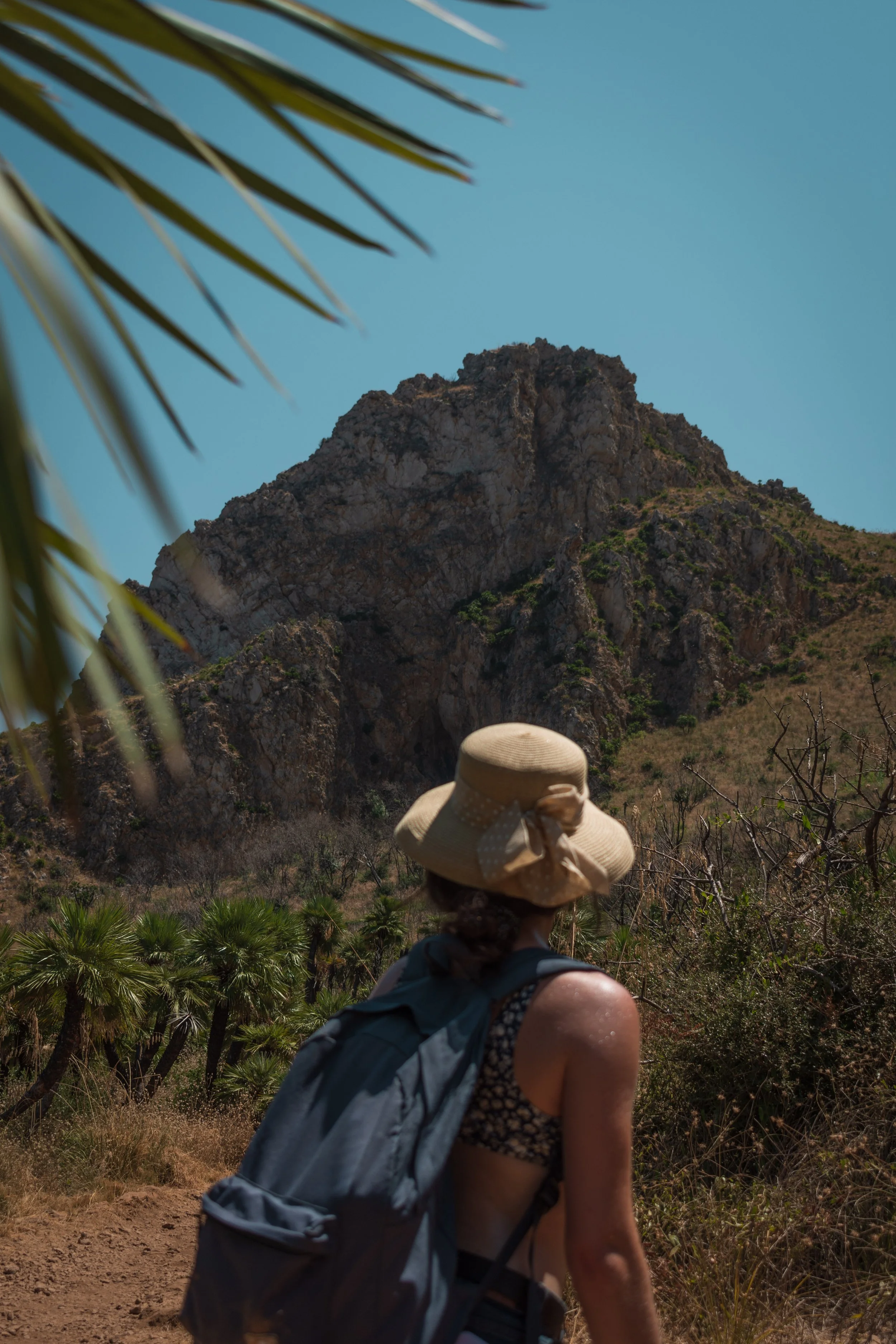 A woman hiking on a dirt trail surrounded by desert plants, wearing a large sun hat, a backpack, and a sleeveless top, with a mountain in the background under a clear blue sky.